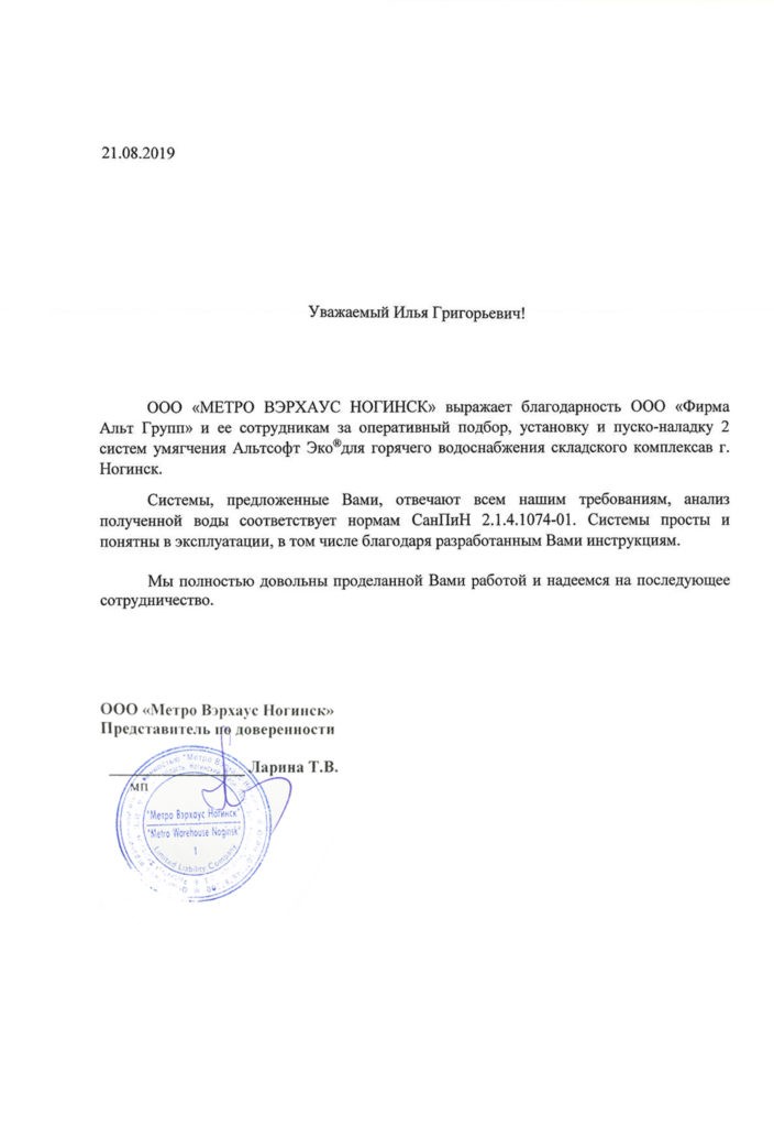 ООО «МЕТРО ВЭРХАУС НОГИНСК» выражает благодарность ООО «Фирма Альт Групп» и ее сотрудникам за оперативный подбор, установку и пуско-наладку 2 систем умягчения Альтсофт Эко® для горячего водоснабжения складского комплекса в г. Ногинск.