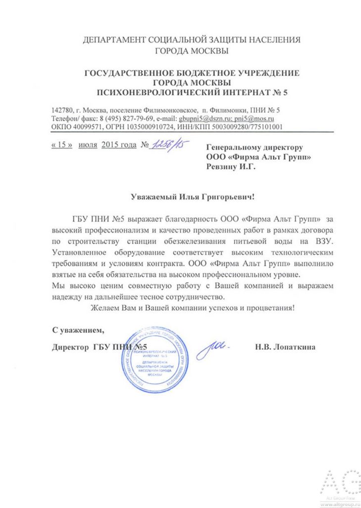 ГБУ ПНИ №5 выражает благодарность ООО «Фирма Альт Групп» за высокий профессионализм и качество проведённых работ в рамках договора по строительству станции обезжелезивания питьевой воды на ВЗУ. Установленное оборудование соответствует высоким технологическим требованиям и условиям контракта. ООО «Фирма Альт Групп» выполнило взятые на себя обязательства на высоком профессиональном уровне.