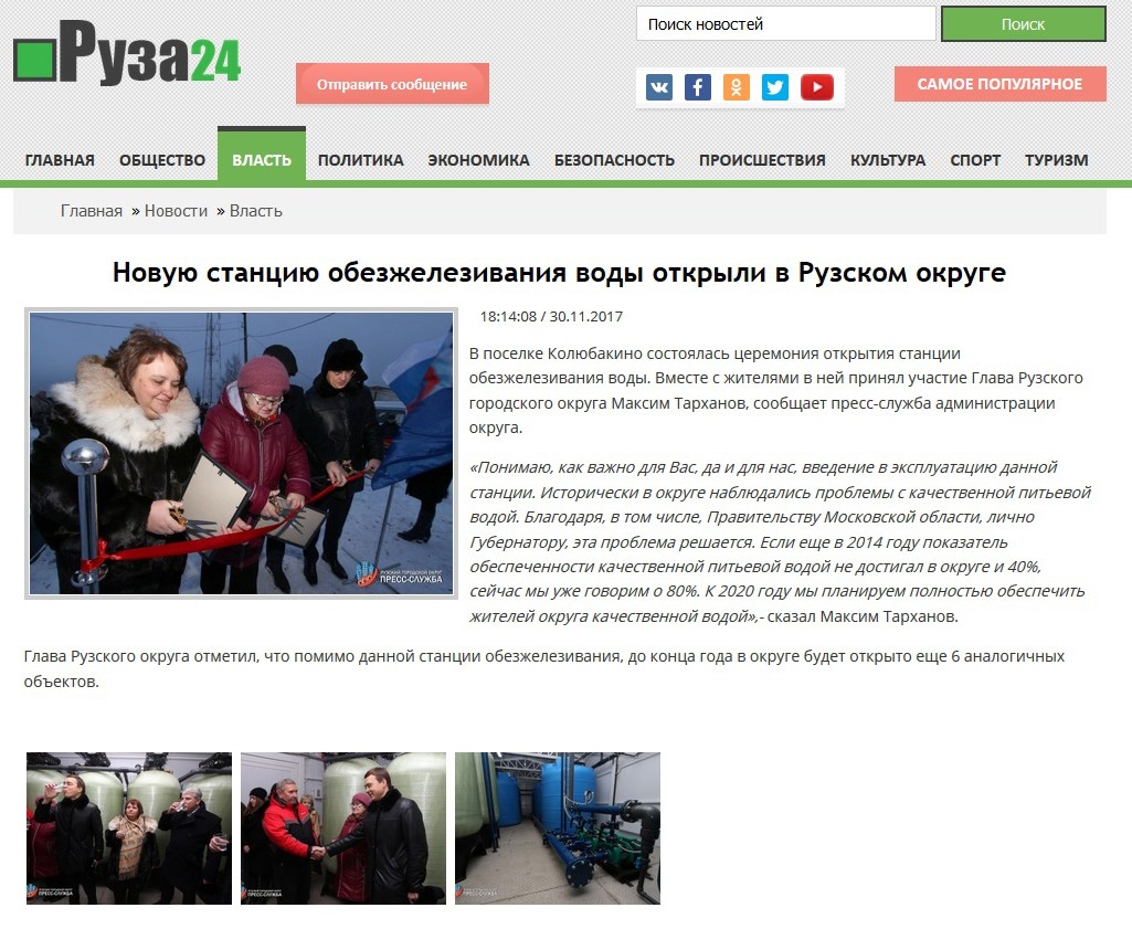 Благодаря сотрудникам Вашей компании, в ТСН «Полуостров» (деревня Якиманское, г.о. Солнечногорск) в 2022 году осуществили модернизацию системы водоподготовки. Была увеличена производительность — до 16,5 м3/ч (300 м3/сут.) ранее установленного не работающего оборудования очистки воды от железа (с концентрацией 3,3 мг/л.), а также осуществлен запуск его в эксплуатацию.