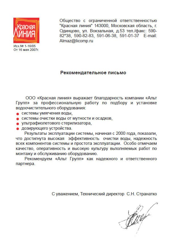 ООО «Красная линия» выражает благодарность компании «Альт Групп» за профессиональную работу по подбору и установке водоочистительного оборудования: системы умягчения, системы очистки воды от мутности и осадков, ультрафиолетового стерилизатора, дозирующего устройства.