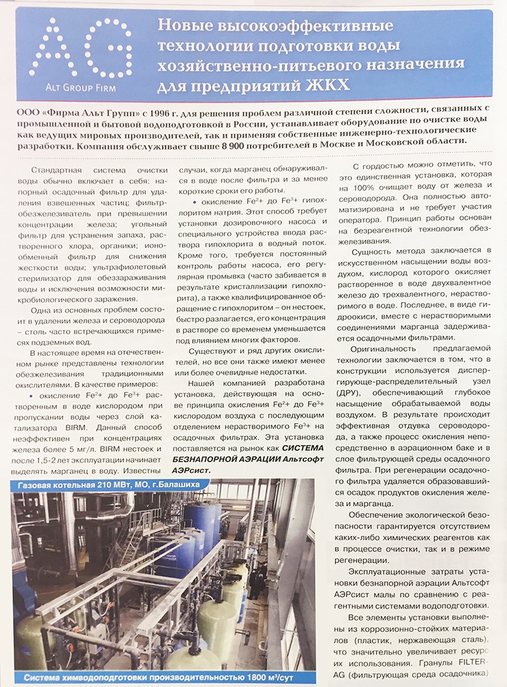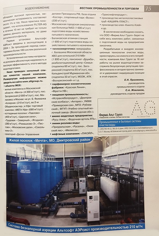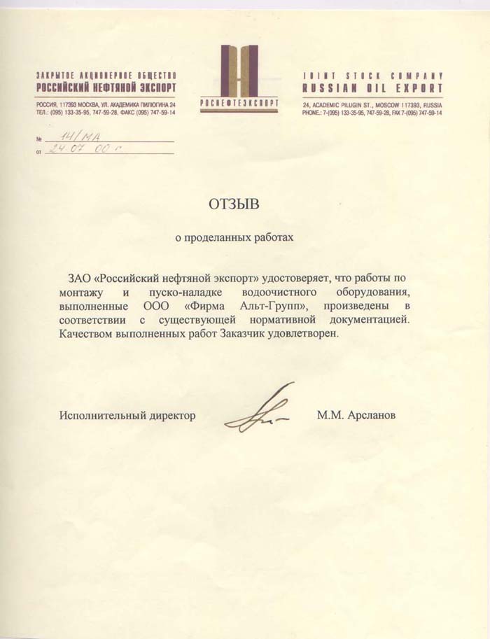 Результаты эксплуатации системы, начиная с 2000 года, показали, что достигнута высокая эффективность очистки воды, надежность всех компонентов системы и проста в эксплуатации. Особо отмечаем качество, оперативность и высокую культуру выполняемых работ по монтажу и обслуживанию оборудованию. Рекомендуем «Альт Групп» как надежного и ответственного партнера.