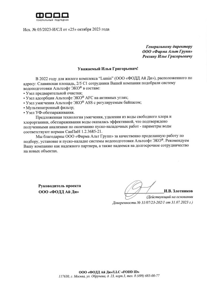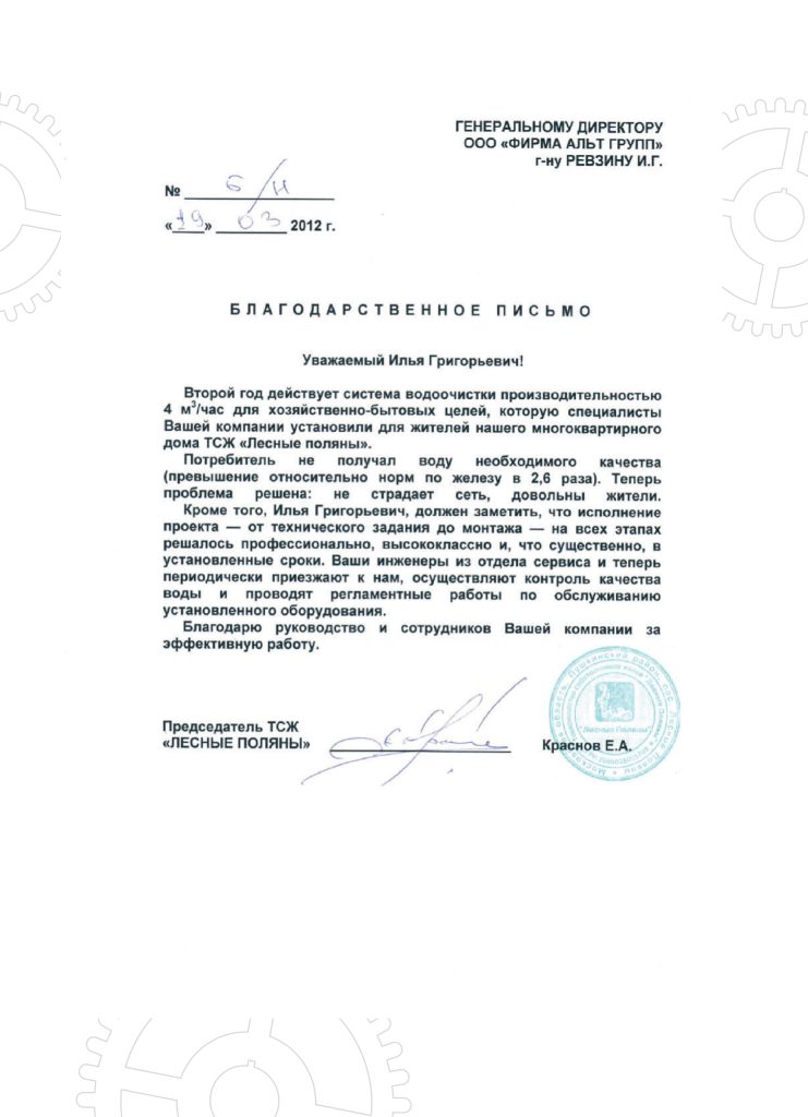 Выражаем благодарность за своевременное и качественное исполнение договора, профессионализм при выборе технологии очистки воды и оперативную установку системы. Будем рады продолжить сотрудничество в будущем, рекомендуем ООО «Фирма Альт Групп» как надежного и добросовестного партнера.