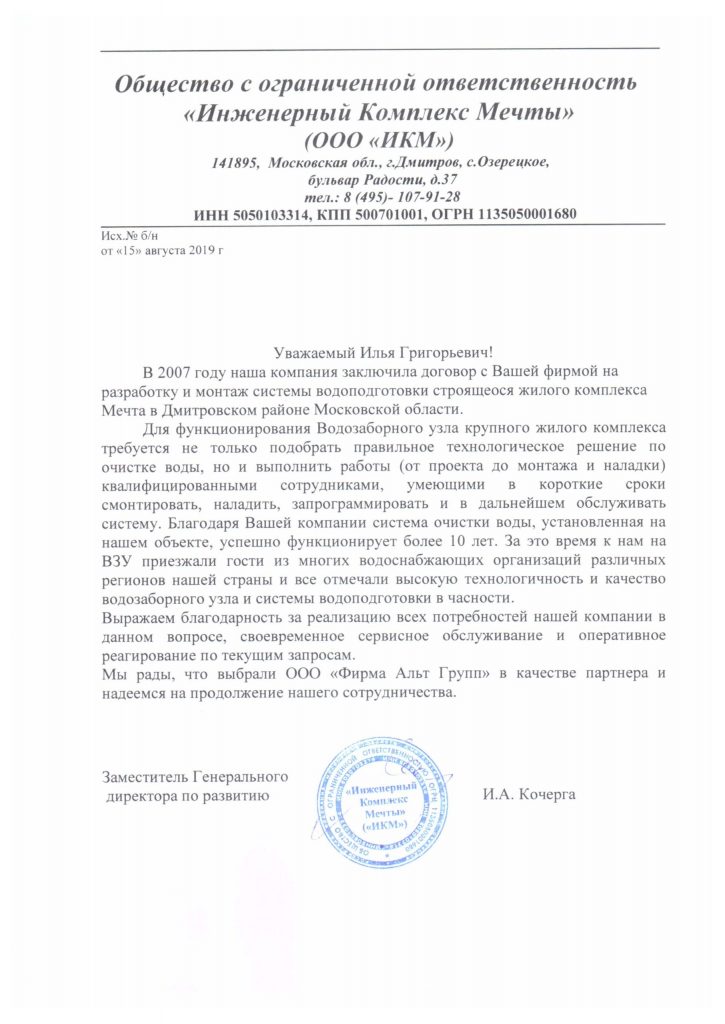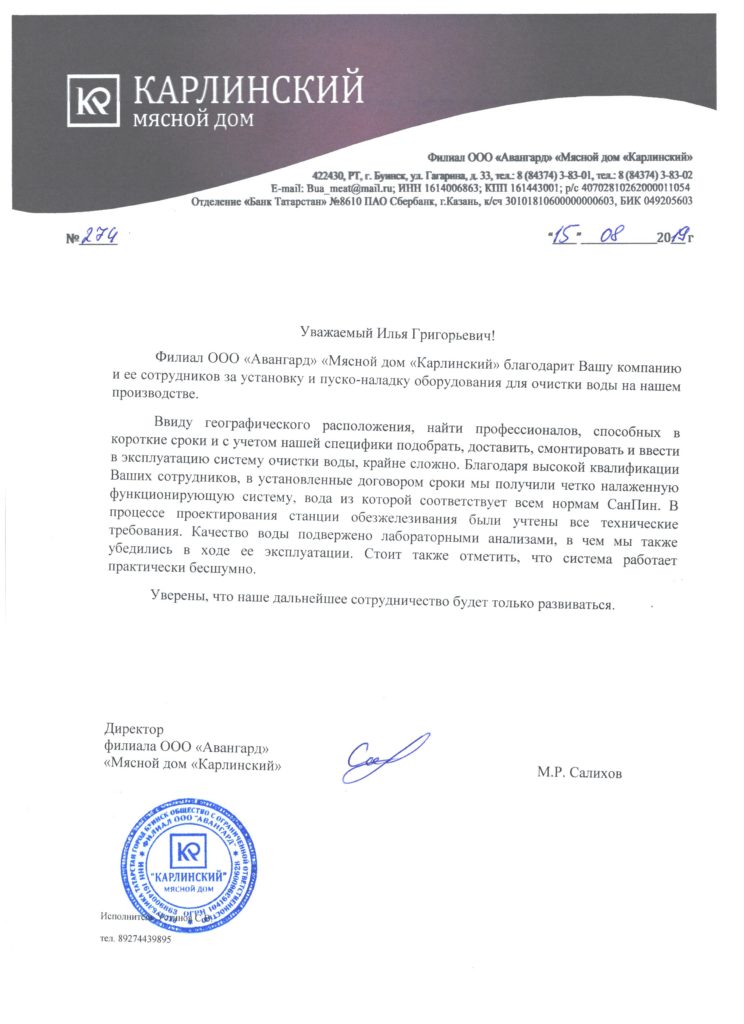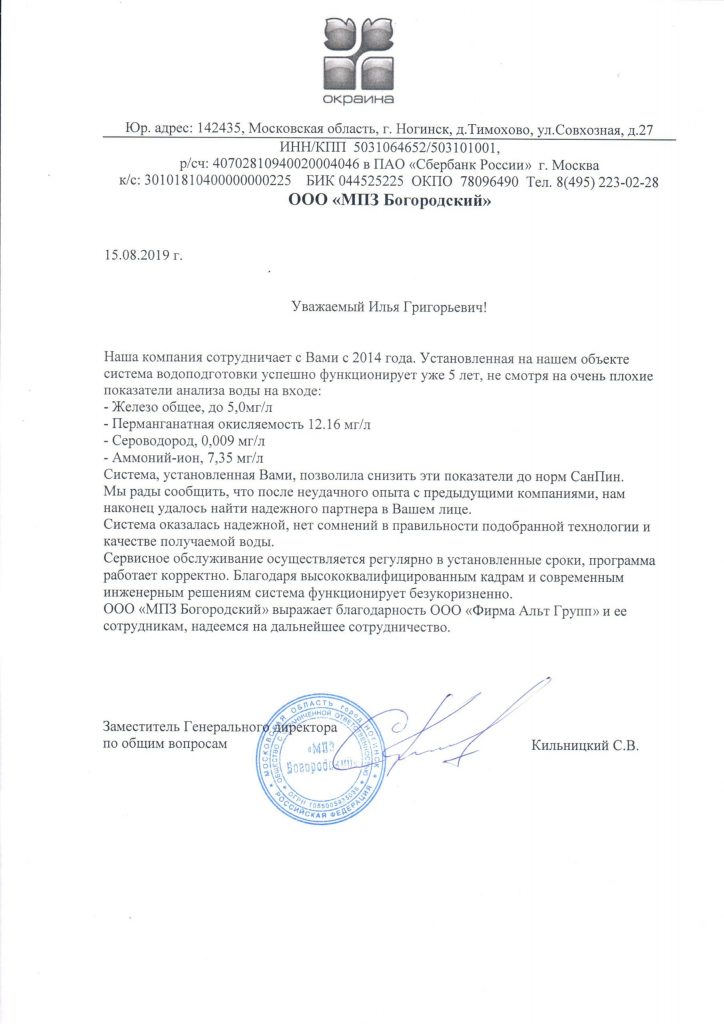 Наша компания сотрудничает с Вами с 2014 года. Установленная на нашем объекте система водоподготовки успешно функционирует уже 5 лет, не смотря на очень плохие показатели...                Подробнее