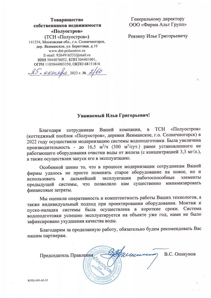 Дорогие читатели! В 2022 году сотрудники Фирмы Альт Групп осуществили модернизацию системы водоподготовки для ТСН «Полуостров» (деревня Якиманское, г.о. Солнечногорск). И вот спустя год мы... Подробнее