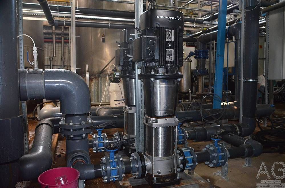 Насосная группа подачи воды (2х50 м3./ч.) из аэрационных емкостей в систему водоочистки первой ветки. Состоит из насосов фирмы «Grundfos” с частотным преобразователем.